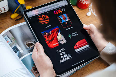 Paris, France - Apr 16, 2020: Woman looking on Apple Computers internet website on iPad Pro tablet in room environment showcasing new iPhone SE specifications