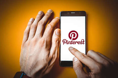 Pinterest. Smartphone in male hand on Pinterest smartphone screen on blue, yellow, black background. July 2020. Kiev, Ukraine.
