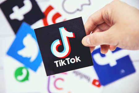 WROCLAW, POLAND - August, 29th 2020: Hand holds TikTok logo over another social media symbols. TikTok is a Chinese video-sharing social networking service