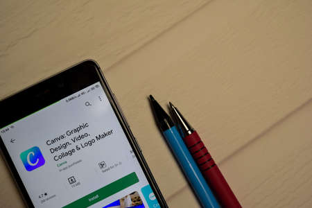 BEKASI, WEST JAVA, INDONESIA. APRIL 1, 2020 : Canva: Graphic Design dev application on Smartphone screen. Flyers, Logos, Posters is a freeware web browser developed by Canva