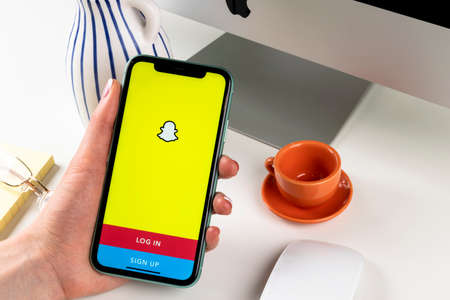 Helsinki, Finland, January 30, 2020: Snapchat application icon on Apple iPhone 11 smartphone screen close-up in woman hands. Snapchat app icon. Social media icon. Social network