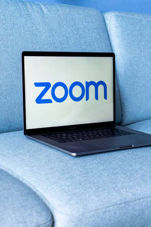 Laptop showing Zoom Cloud Meetings app logo. Work and have meetings from home.