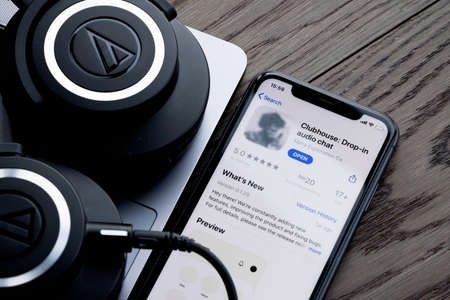 Clubhouse application view on the smartphone, controversy 2021 that hides behind the Social app. Clubhouse drop in audio chat application view on the smartphone