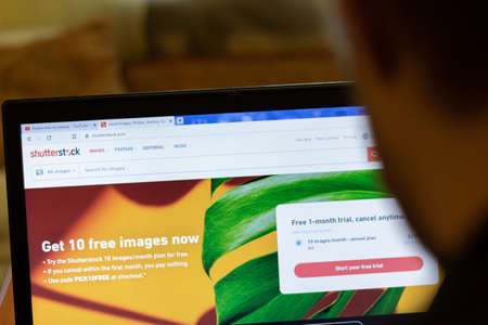 New York, USA - 9 April 2020: Shutterstock website on laptop screen close up. Man using service on display, blurry background, Illustrative Editorial.