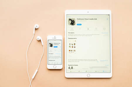 Belorechensk, Russia - March 1, 2021: Clubhouse application view on the smartphone and digital tablet and earphones. Top view flat lay