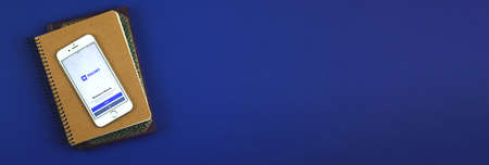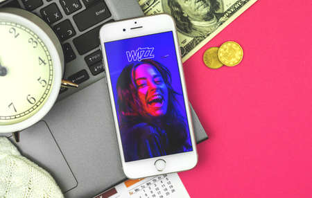 Kharkov, Ukraine - February 5, 2021: close up Wizzair application on Apple smartphone, Hungary airlines app background, creative flat lay banner for traveler