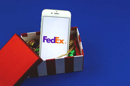 Kharkov, Ukraine - February 22, 2021: FedEx app logo of shipping company displayed on Apple smartphone screen, creative composition, copy space photo