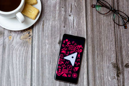 02-24-2021 Portsmouth, Hampshire, UK A mobile phone or cell phone on a wooden table with the OS maps app open next to a coffee and glasses
