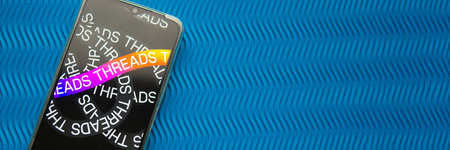Tver, Russia - July 15, 2023, threads logo on the smartphone screen, on a blue background. The threads icon. The logo of the current application. Threads social network.