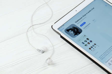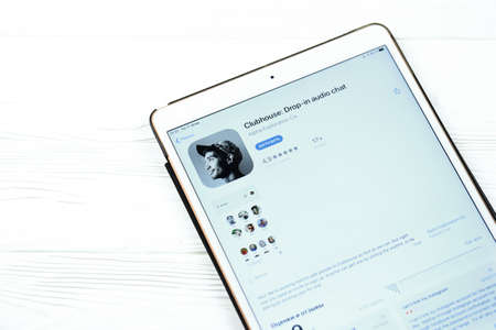 KHARKOV, UKRAINE - FEBRUARY 14, 2021: Clubhouse app in app store market on ipad display screen. Clubhouse is invitation only audio chat iPhone app launched in April 2020