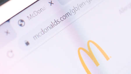 McDonalds domain name in browser and logo on the computer screen. Editorial macro shot