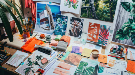 A creative team brainstorming around a table covered with printed graphics, design drafts, and mood boards, with a focus on collaborative planning.