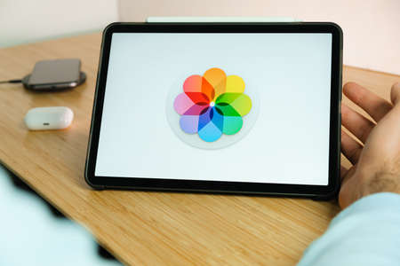 Apple Photos logo on the screen of iPad tablet. March 2021, San Francisco, USA