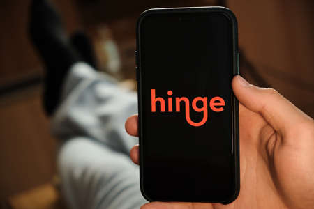 Hinge logo of dating application on the screen of mobile phone in males hand, June 2021, San Francisco, USA