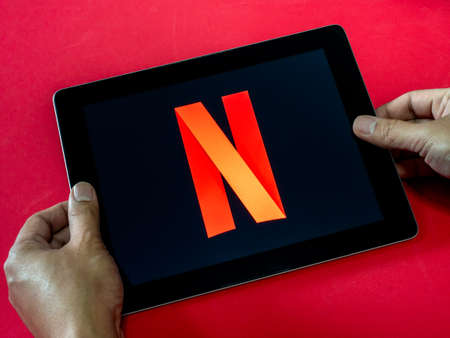 Bangkok, Thailand - April 17, 2020: Hand holding tablet with N or Netflix logo on dark background on red background. Netflix is famous global provider of streaming movies and series.