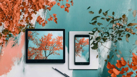 Autumn inspired flat lay with digital devices showcasing vibrant orange leaves against a teal background, perfect for seasonal marketing and design concepts
