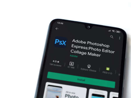 Lod, Israel - July 8, 2020: Adobe Photoshop Express Photo Editor app play store page on the display of a black mobile smartphone isolated on white background. Top view flat lay with copy space.