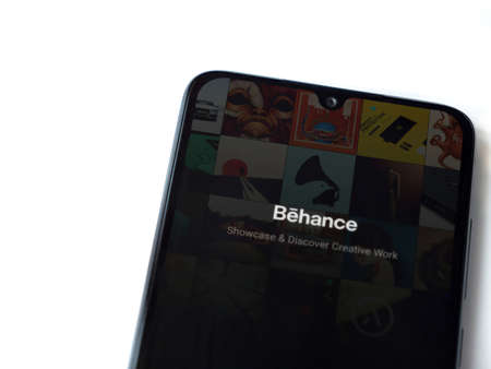Lod, Israel - July 8, 2020: Adobe Behance app launch screen with logo on the display of a black mobile smartphone isolated on white background. Top view flat lay with copy space.