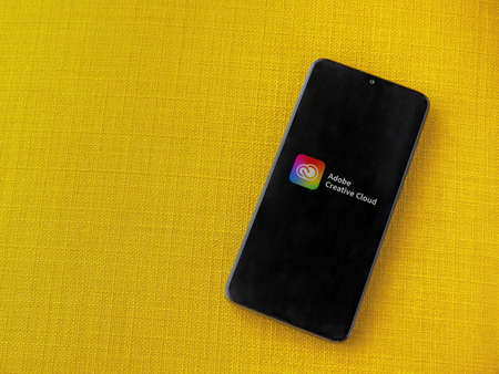 Lod, Israel - July 8, 2020: Adobe Creative Cloud app play store page on the display of a black mobile smartphone on a yellow fabric background. Top view flat lay with copy space.