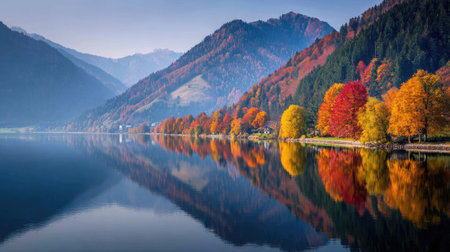 Colorful autumn landscape with alpine lake and mountains reflected in water
