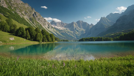 Beautiful alpine lake with clear blue water and mountains in background