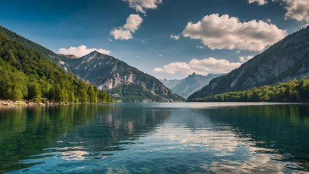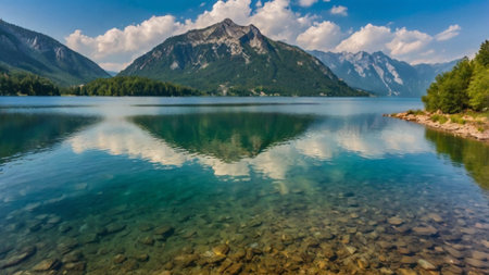panoramic view of alpine lake with crystal clear water and reflection in water