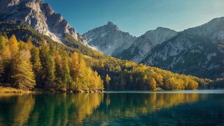 A tranquil alpine lake reflects vibrant fall foliage, encircled by dense green woods beneath a clear azure sky, evoking peaceful autumn serenity.