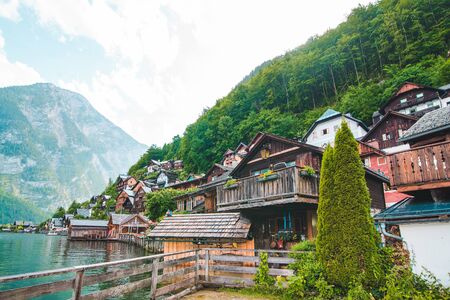 view of hallstatt old wooden buildings alps mountains on background austria