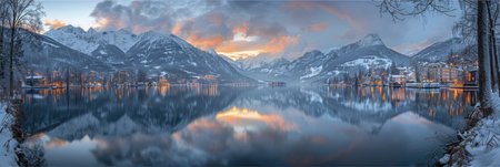 A tranquil lake reflects the stunning sunset over snow covered mountains, enhancing the winter beauty of the area.
