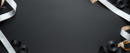 Elegant black background with ribbons, perfect for celebration themes, luxury designs, and sophisticated presentations. Ideal for creating invitations, holiday cards, and branding materials.