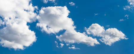 Sunlit white clouds on blue sky in abstract panoramic cloudscape background. Scenic panorama with beautiful group of fluffy cloud cumuli in summer clear air at hot sunny wheather. Nature conservation.
