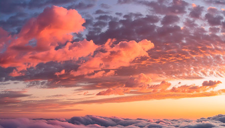 Beautiful sunset sky above clouds with colorful romantic light.