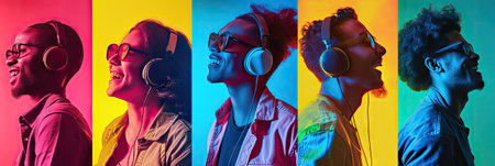 Neon Portraits, Emotional People Faces Collage, Young People Listen to Music with Headphones, Generative AI Illustration