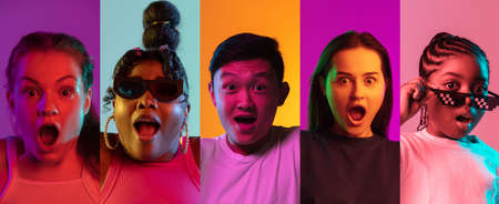 Collage. Portraits of young cheerful people posing isolated over multicolored background. Showing positive emotions. Concept of emotions, facial expression, feelings, fashion, beauty, ad