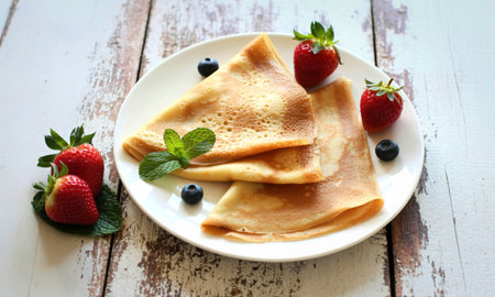 A delightful serving of thin crepes, garnished with vibrant strawberries, blueberries, and fresh mint leaves, presented on a rustic wooden surface.