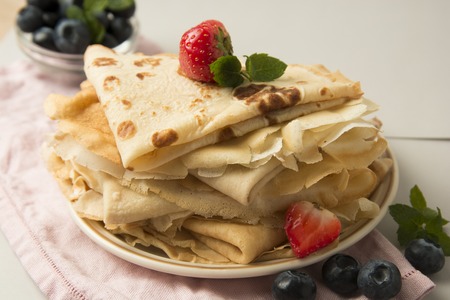 Homemade pancakes, delicious thin pancakes with berries and maple syrup