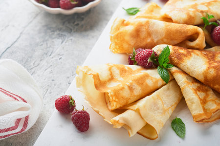 Delicious Tasty Homemade crepes or pancakes with raspberries and mint on table
