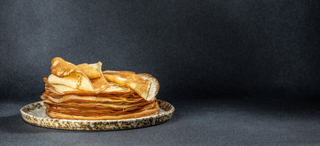 Traditional Russian food - thin pancakes. A stack of crepes on a dark brown wooden background. Rustic style, place for text.