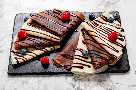 Sweet crepes assortment with berries chocolate on gray background. Homemade food concept. Top view, flat lay