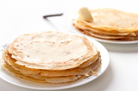 Two plates with many pancakes with butter on white background. Indoors still-life