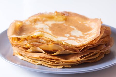 Russian Maslenitsa, Shrovetide, pancake week, carnival, shrove, pancake day. A stack of pancakes on plate, on light background, close-up. Soft focus.
