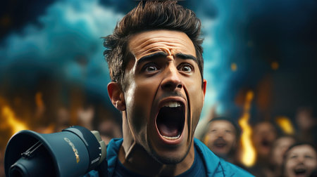 A man shouts in anger, surrounded by smoke and sparks, capturing intense emotion, conflict, and the raw power of human expression.