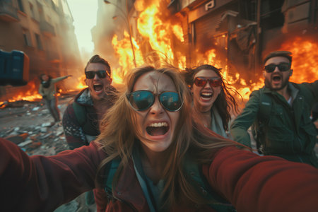 A man is captured in a moment of sheer terror, screaming with an expression of panic as he stands in front of a massive explosion. The sky is filled with ominous smoke and flames, creating a chaotic and dramatic atmosphere.