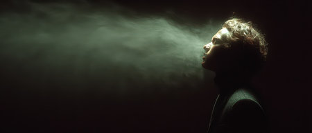 A person stands in a dark environment with smoke rising from their head creating a mysterious and dramatic atmosphere.