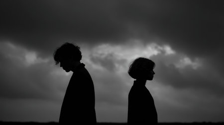 Two figures are silhouetted against a dramatic, overcast sky. The image presents a monochromatic palette emphasizing contrast and form. The composition highlights the subjects in a moment of separation, suggesting introspection or contemplation. This visual could be used in various commercial and editorial contexts related to themes of isolation or relationships.