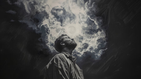 A thoughtful man stands alone under a dramatic sky filled with heavy clouds. The image captures an atmosphere of reflection, anticipation, and solitude.