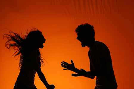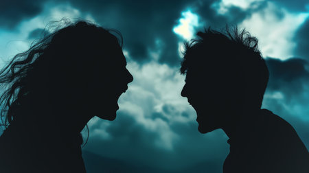 Two people argue passionately, silhouetted against a stormy sky, depicting tension and disagreement