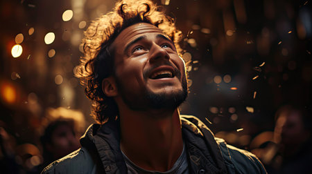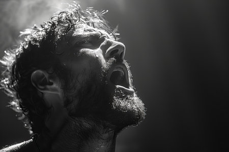 Model posing with light illuminating her face and looking up with a sense of awe and wonder. Ai generated