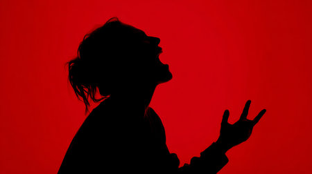 Silhouette of a young woman on a red background. Emotion.