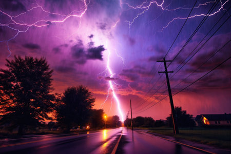 AI Generated. Spectacular lightning illuminates a purple stormy sky during a summer night over a quiet landscape